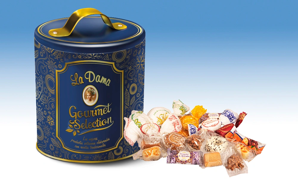 Selección de las mejores especialidades artesanas, 12 variedades; polvorones de almendra, roscos de vino y almendra, Alfajores de almendra, mantecados de artesanía, mantecados de almendra, mantecados de limón, rufinos de chocoblanco, tronquitos de almendra bañados de cacao, artesanitas de almendra, Damachoc, figuritas de mazapán y Damarocas, presentados en una elegante y original lata metalica decorada.